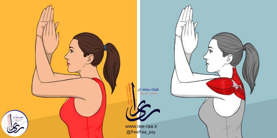 کشش گردن و قسمت بالای پشت بدن (عضلات ذوزنقه ای فوقانی که در دو طرف گردن قرار گرفته اند):